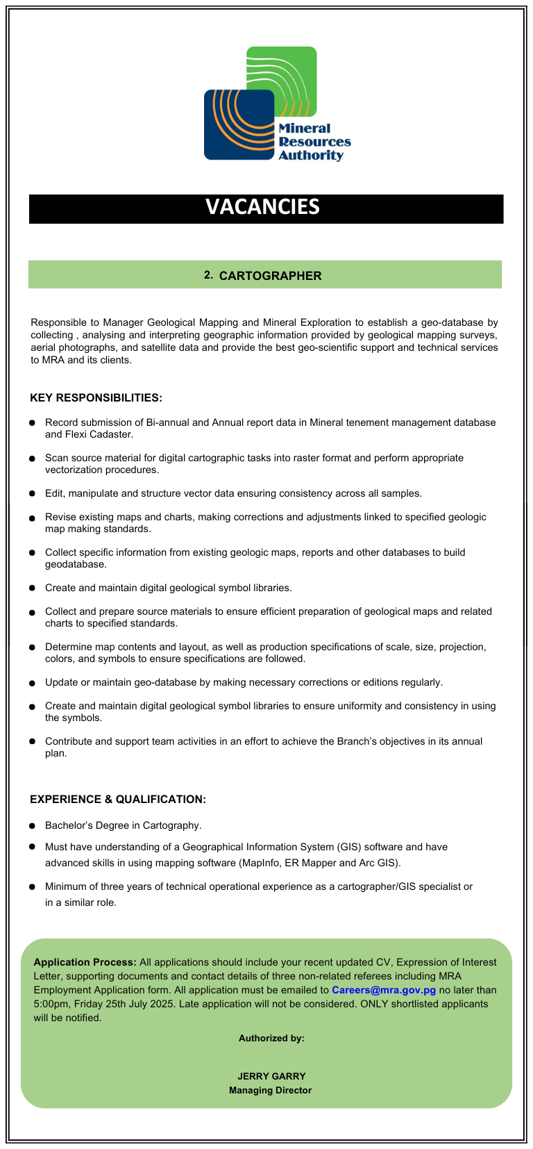 The Mineral Resources Authority (MRA) was established by virtue of the repeal Mineral Resources Authority Act 2018 as a Statutory Authority mandated to regulate and promote the Mining Industry in Papua New Guinea. We are currently seeking to recruit qualified, experienced and competent personal for the following vacant positions; Corporate Services Division 2. CS.019-PAYROLL ASSISTANT Responsible for the maintenance and processing of the payroll that has the functional responsibilities of the payroll Administrator.