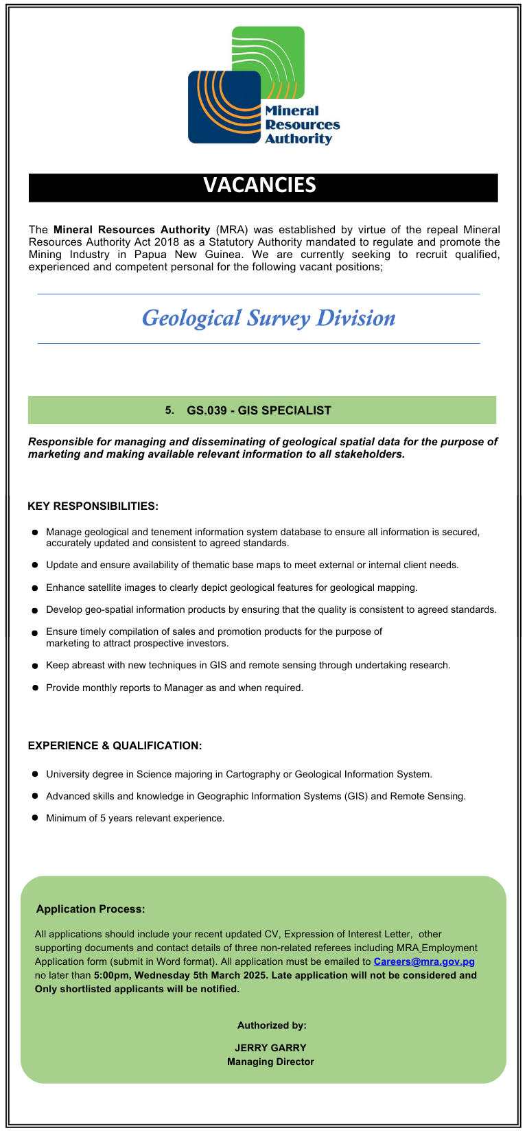 The Mineral Resources Authority (MRA) was established by virtue of the repeal Mineral Resources Authority Act 2018 as a Statutory Authority mandated to regulate and promote the Mining Industry in Papua New Guinea. We are currently seeking to recruit qualified, experienced and competent personal for the following vacant positions;