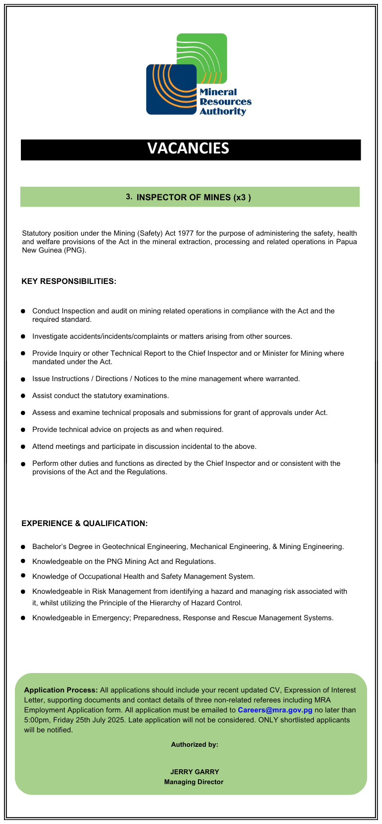 The Mineral Resources Authority (MRA) was established by virtue of the repeal Mineral Resources Authority Act 2018 as a Statutory Authority mandated to regulate and promote the Mining Industry in Papua New Guinea. We are currently seeking to recruit qualified, experienced and competent personal for the following vacant positions; Corporate Services Division 2. CS.019-PAYROLL ASSISTANT Responsible for the maintenance and processing of the payroll that has the functional responsibilities of the payroll Administrator.