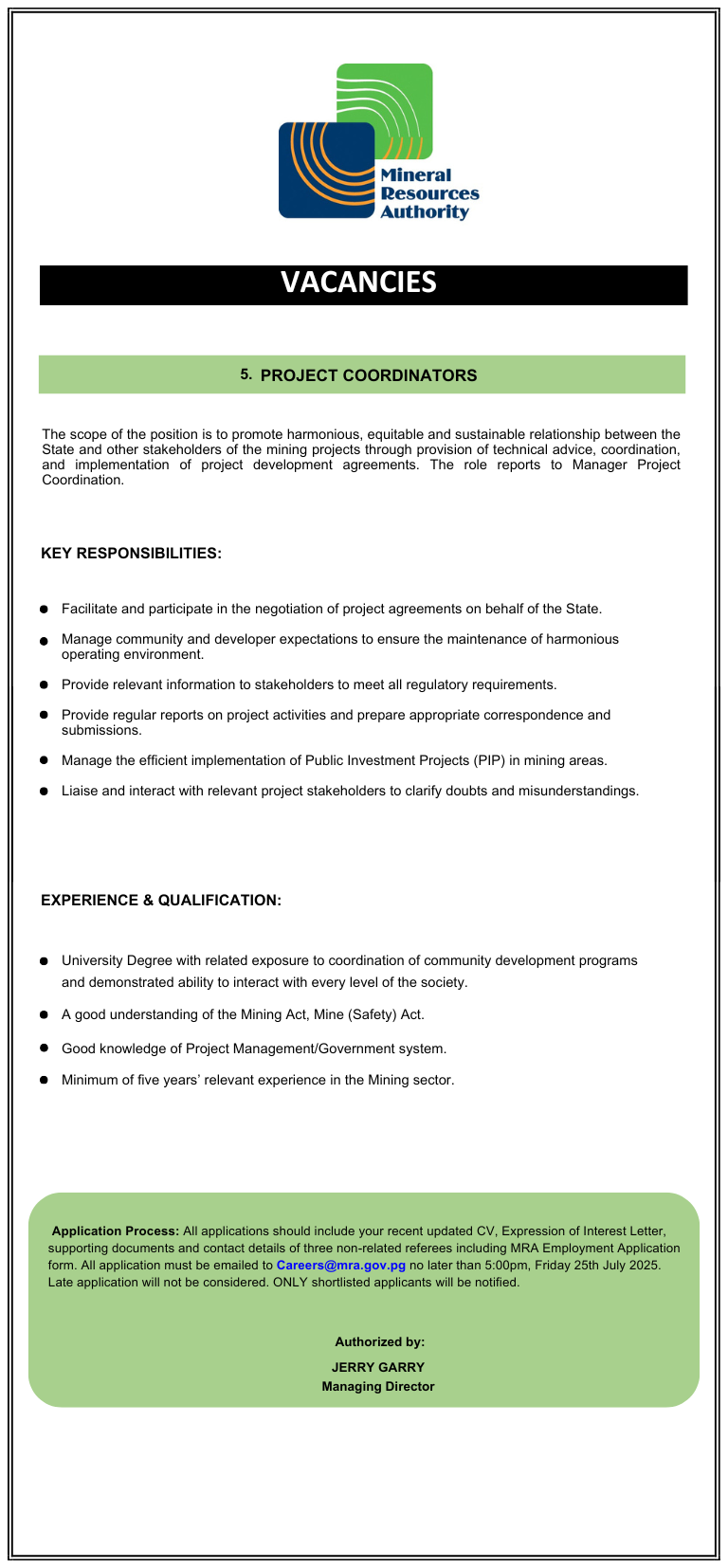 The Mineral Resources Authority (MRA) was established by virtue of the repeal Mineral Resources Authority Act 2018 as a Statutory Authority mandated to regulate and promote the Mining Industry in Papua New Guinea. We are currently seeking to recruit qualified, experienced and competent personal for the following vacant positions;